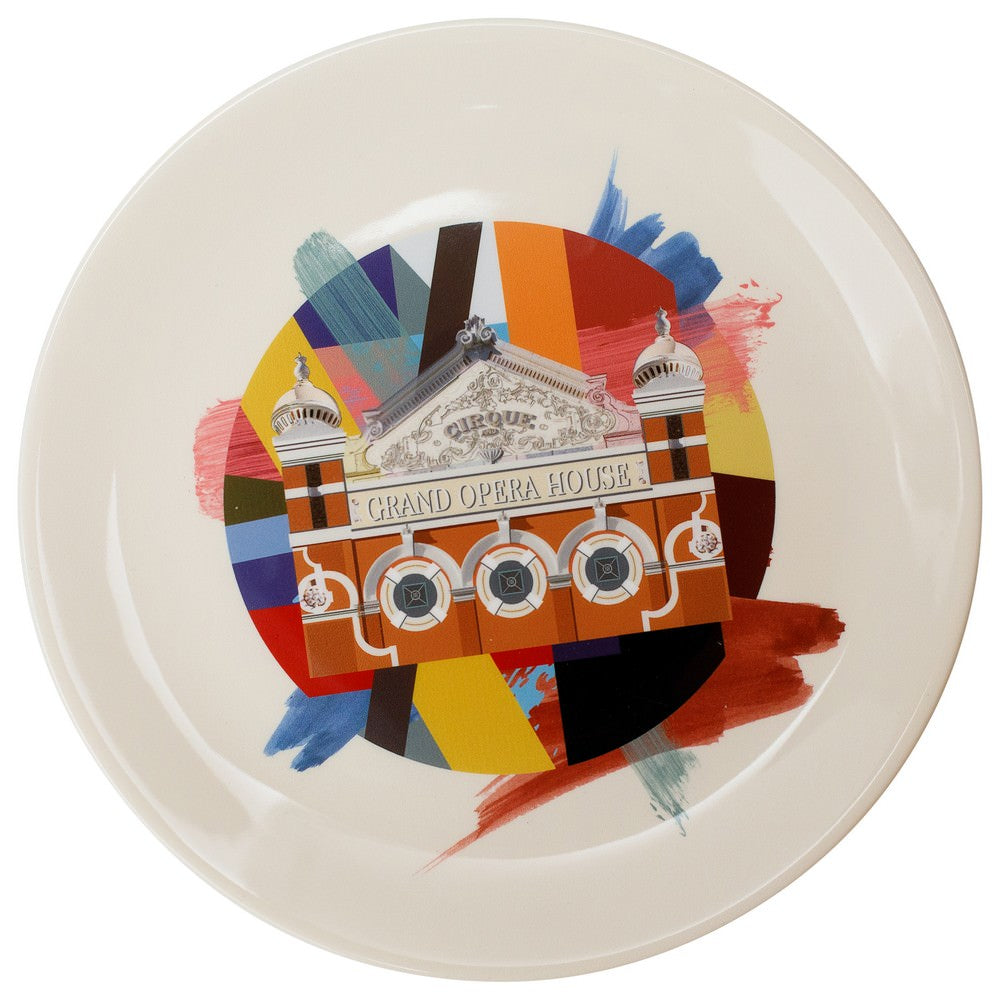 Fine bone china decorative plate with Belfast's world renowned Victorian era Grand Opera House, designed by the most prolific theatre architect of the period, Frank Matcham, using geometric graphic design by Carrie Neely, this stunning bone china plate is the perfect gift following a visit to this amazing city or simply because it is beautifully designed and made.